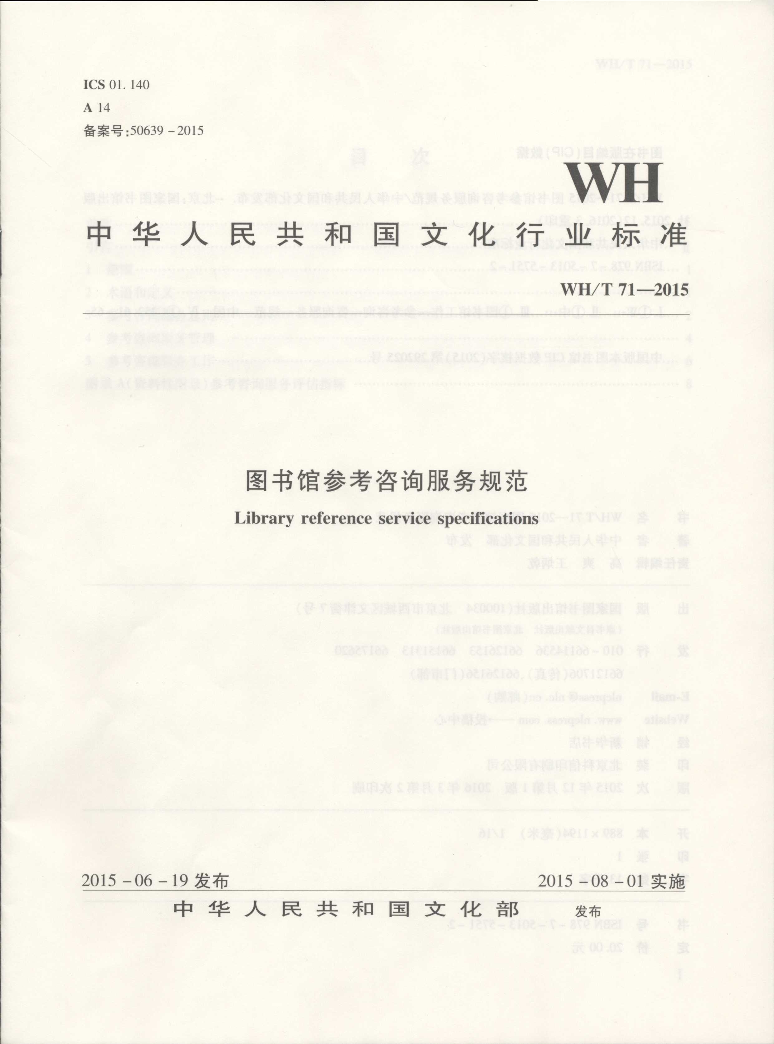 WH/T 71—2015 图书馆参考咨询服务规范